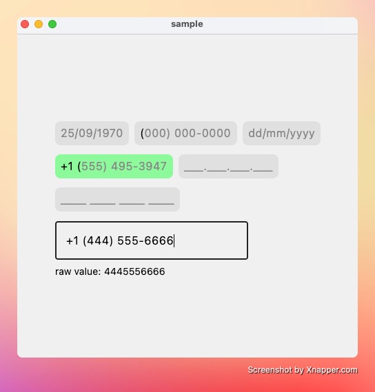 )This is a small project to bring a few functions that solve an input-mask problem in compose. There is already added one implementation for demo in compose: PasswordVisualTransformation, but this is not enough. If you already knew what it costs to bring your own mask for your compose-project, this project can help you.