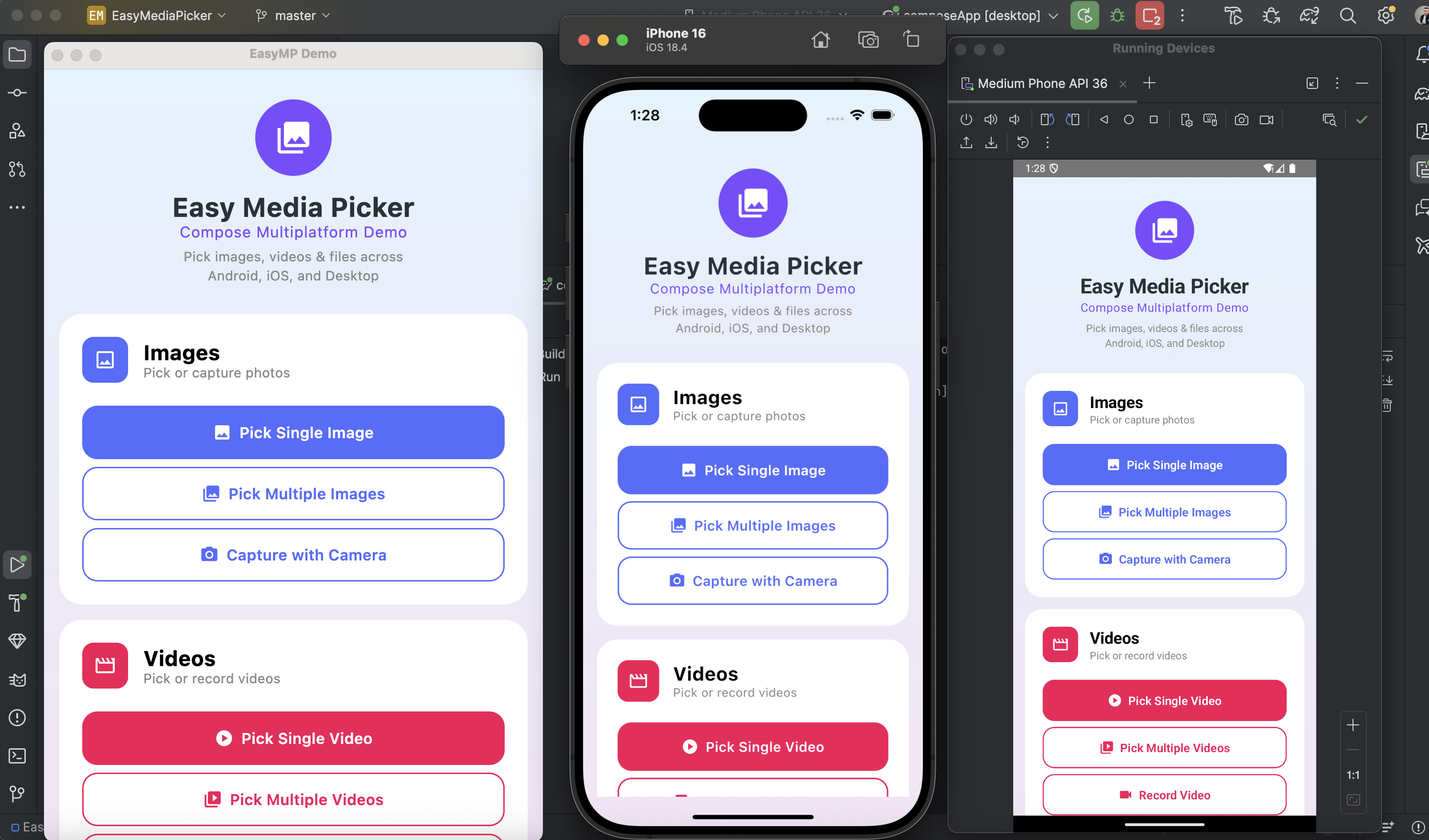 EasyMediaPicker KMP is the multiplatform evolution of EasyMediaPicker. It provides a unified, coroutine-based API for media picking operations across all supported platforms.