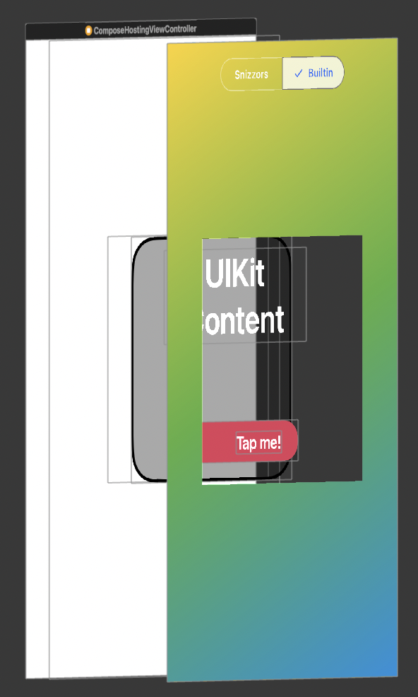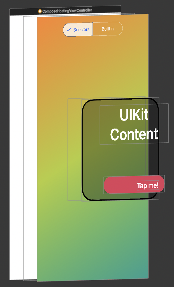 }Snizzors manages the view hierarchy on iOS, ensuring that the specified UIKit view or view controller is added to a layer above the Compose content, rather than below it. This enables the correct rendering of transparency and allows for a more natural integration of native UI components.
