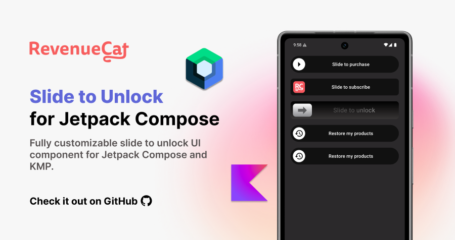 If you want to learn more about how to implement the slide-to-unlock library, how to integrate it with RevenueCat's in-app purchases in Jetpack Compose, and explore real-world examples, check out Enhance in-app purchase experiences with slide to unlock in Jetpack Compose.