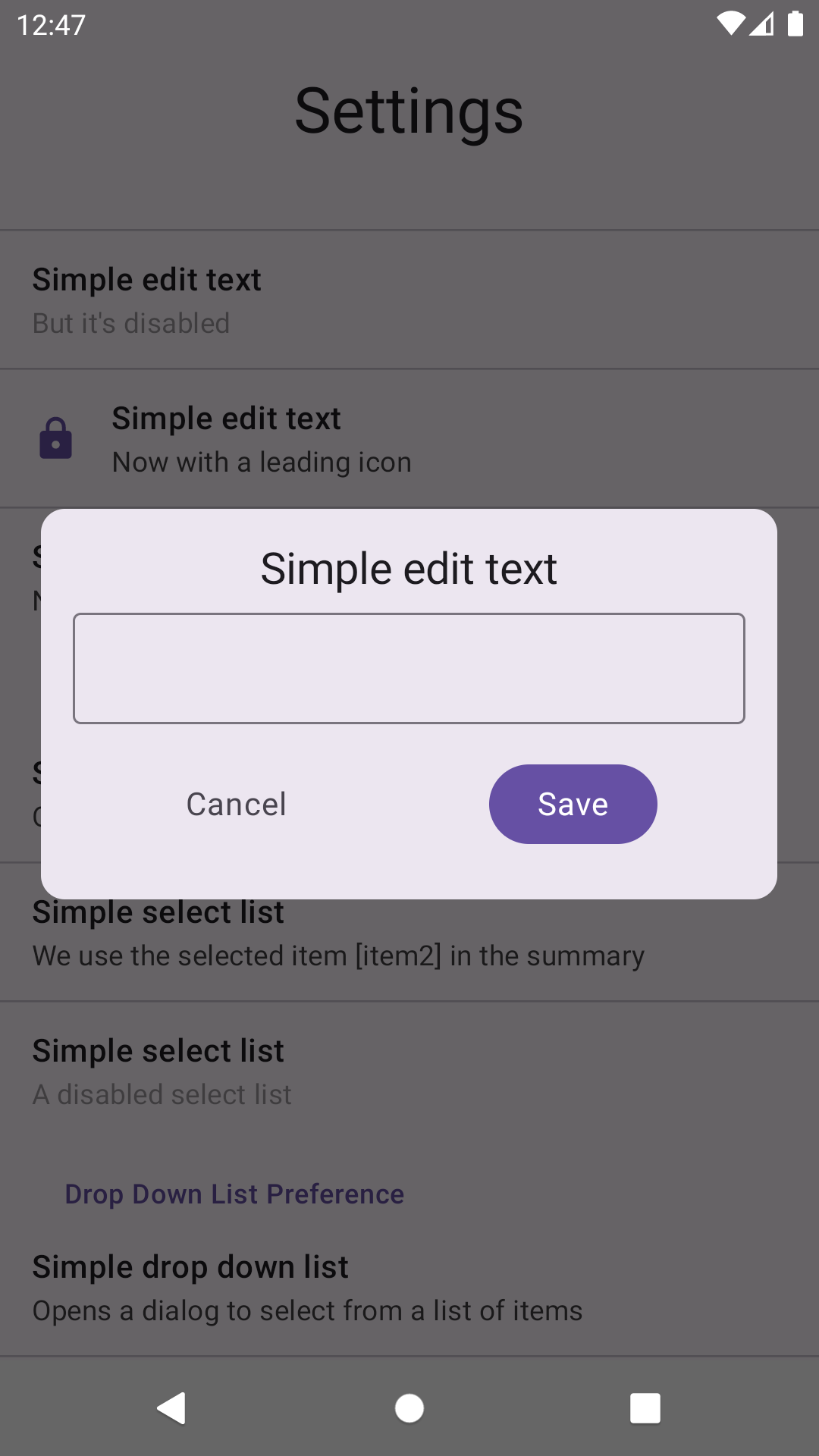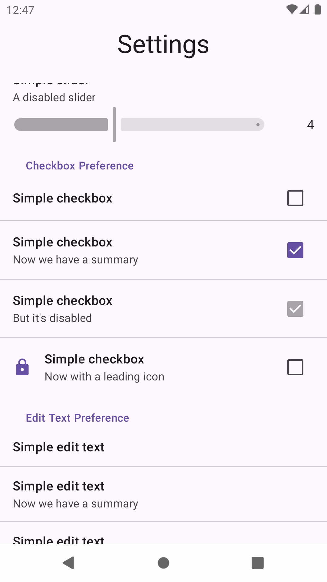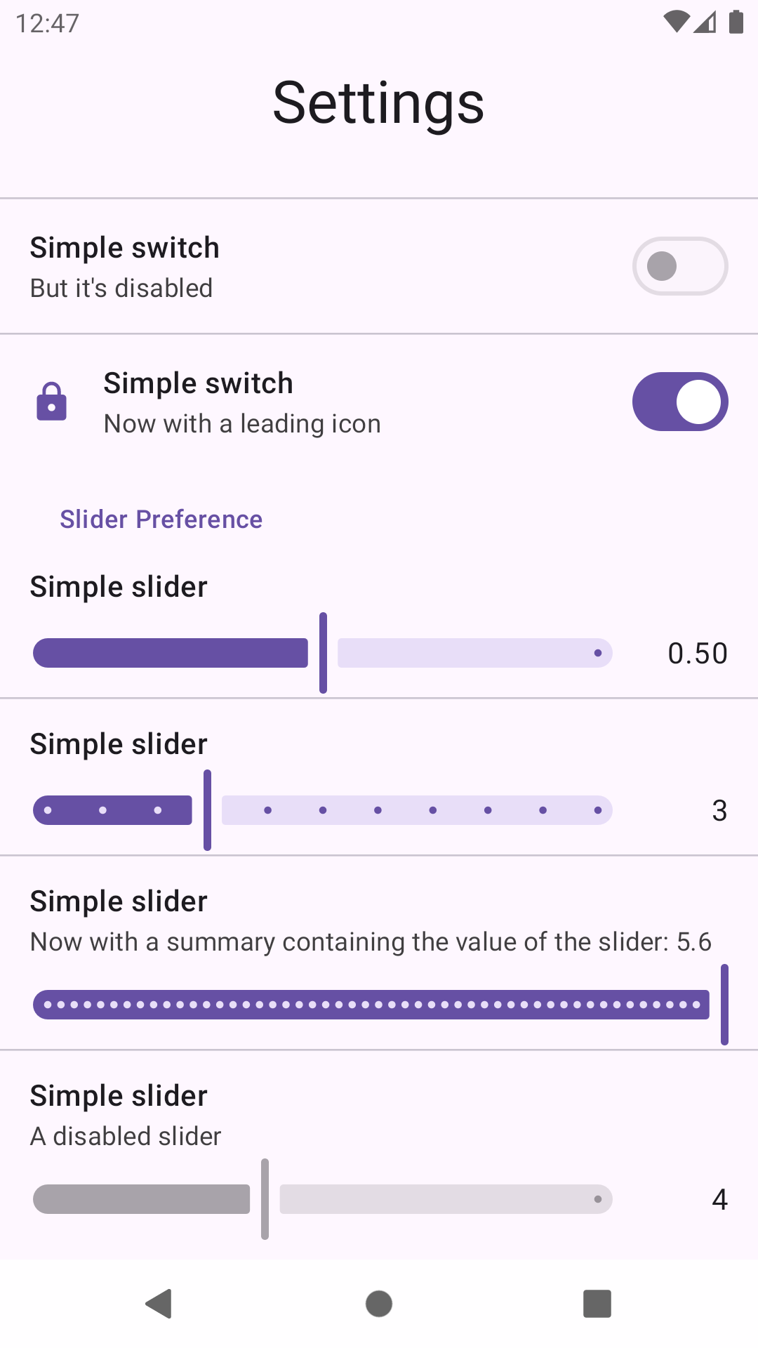 )And that's it! You can create your whole preference screen in this way, and you can modify the individual parameters of each preference composable to achieve the functionality you require. If something is missing, please create an Issue so we can discuss possible solutions.