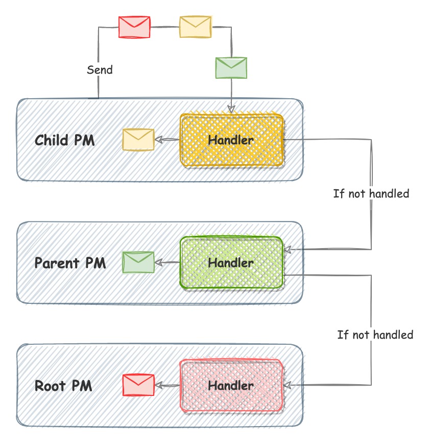 Navigation commands can be the such event. A Child PM sends a message and then its Parent PM can intercept this message and push the next Child PM into the Stack Navigator.