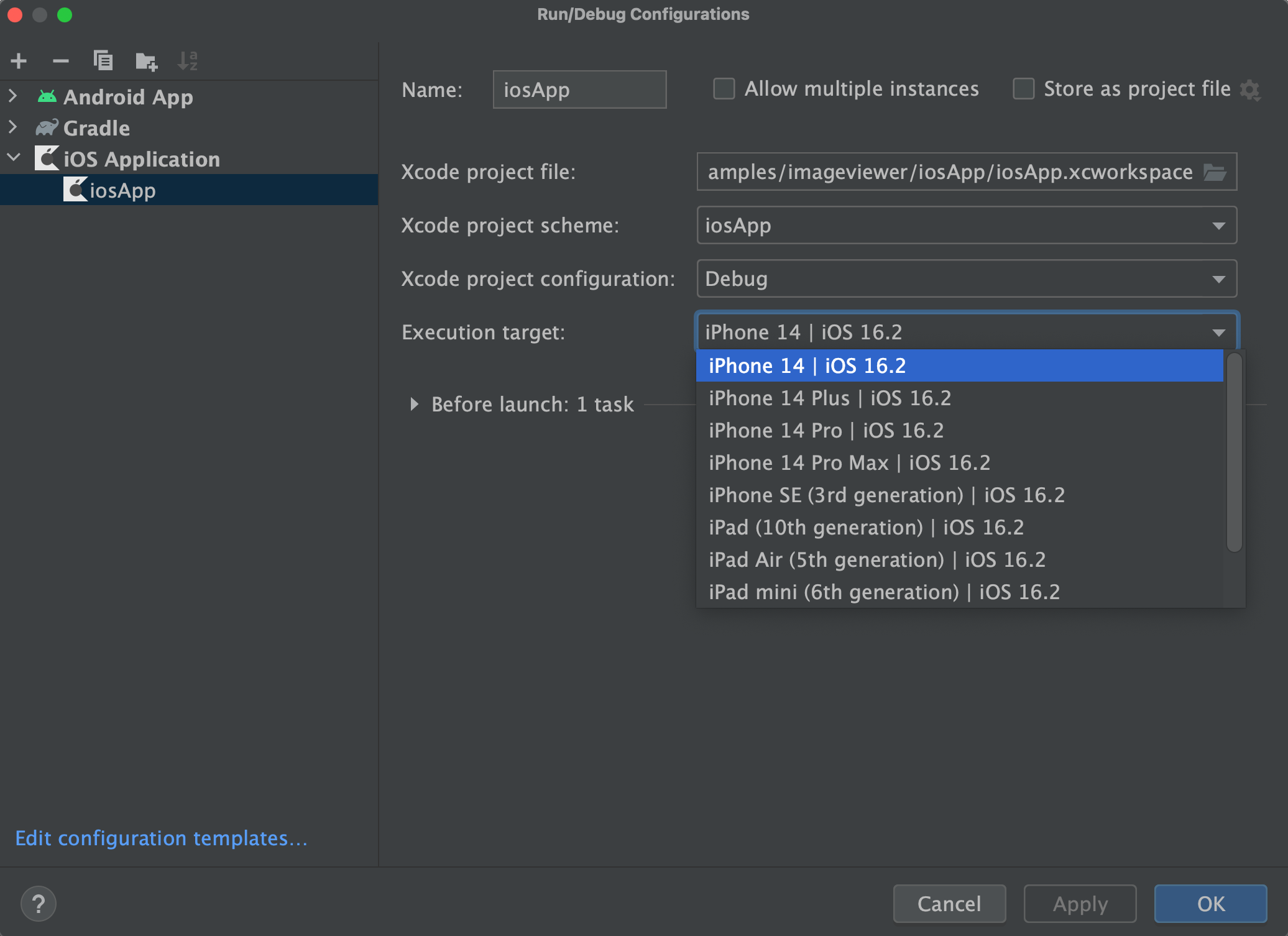 To run your application on an iOS simulator in Android Studio, modify the iosApp run configuration: