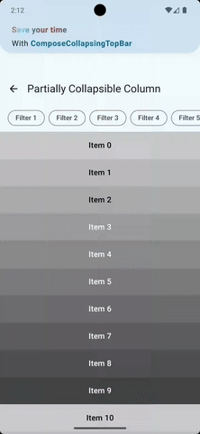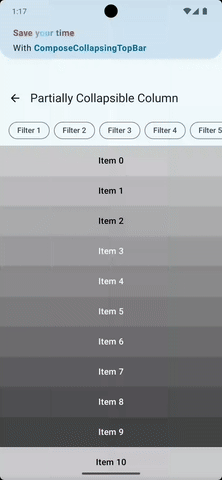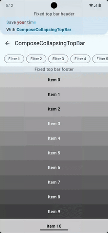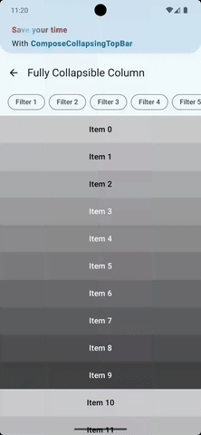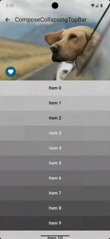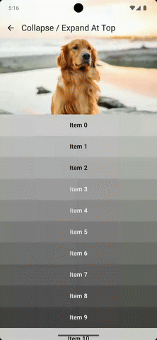Modifier.nestedCollapse()Defines a connection between an element with a custom nested collapsing mechanism and the top bar. Should be used when creating custom complex collapsing elements, e.g., CollapsingTopBarColumn.