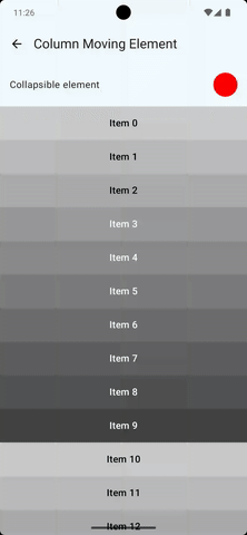 Modifier.pinWhenCollapsed()Unlike the default placement behavior that stops sliding an element when it is fully collapsed, this modifier makes the element continue its movement (pin). Useful if you want an element to slide all the way up under other transparent elements.