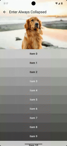 CollapsingTopBarScaffoldScrollMode.enterAlwaysCollapsed()The top bar will collapse to the height of the smallest child and then completely exit outside its bounds. Then it'll enter collapsed anywhere in the list and fully expand only at the top.