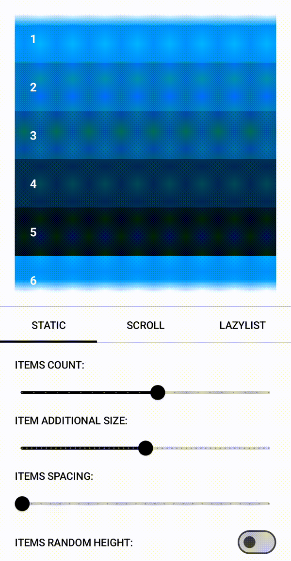 Scroll: The dynamic fading edges for a ScrollState content.Lazy.List: The dynamic fading edges for a LazyListState content.Lazy.Grid: The dynamic fading edges for a LazyGridState content.Lazy.StaggeredGrid: The dynamic fading edges for a LazyStaggeredGridState content.The Dynamic content type requires FadingEdgesScrollConfig.