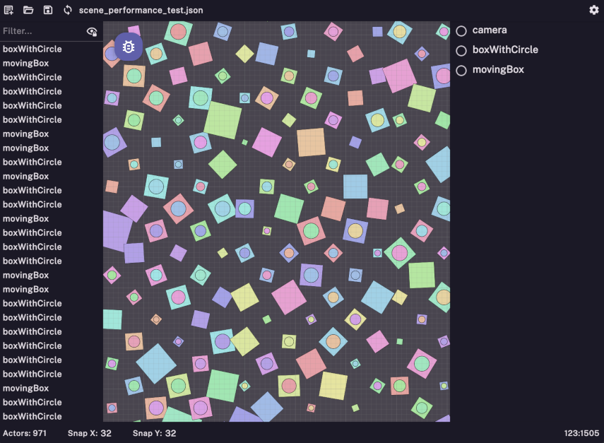 Lightweight 2D game engine enables creation of simple games with modular plugins for scaling, object management, audio, shaders, and physics. Offers tools like Scene Editor and Debug Menu.