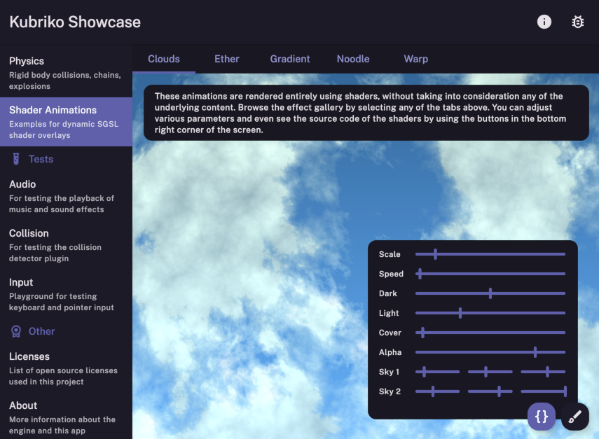 The engine is highly modular, because its core functionality can be extended in a granular fashion using different plugins. These plugins cover most needs of simple games; from viewport scaling and object management, through persistence, input handling, and audio playback, all the way to shaders and physics simulation. Kubriko also offers a number of tools, such as a Scene Editor and a Debug Menu, that can be useful during development.