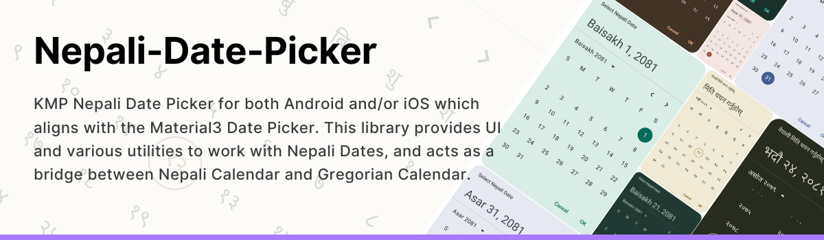 KMP Nepali Date Picker for both Android and/or iOS and/or KMP (JVM, JS, Wasm) which aligns with the Material3 Date Picker. This library provides UI and various utilities to work with Nepali Dates, and acts as a bridge between Nepali Calendar and Gregorian Calendar.