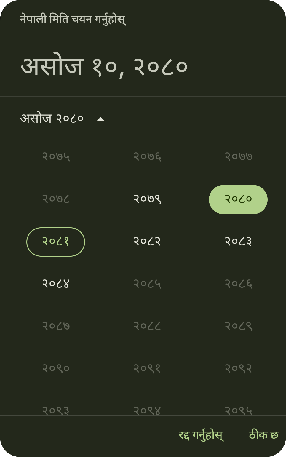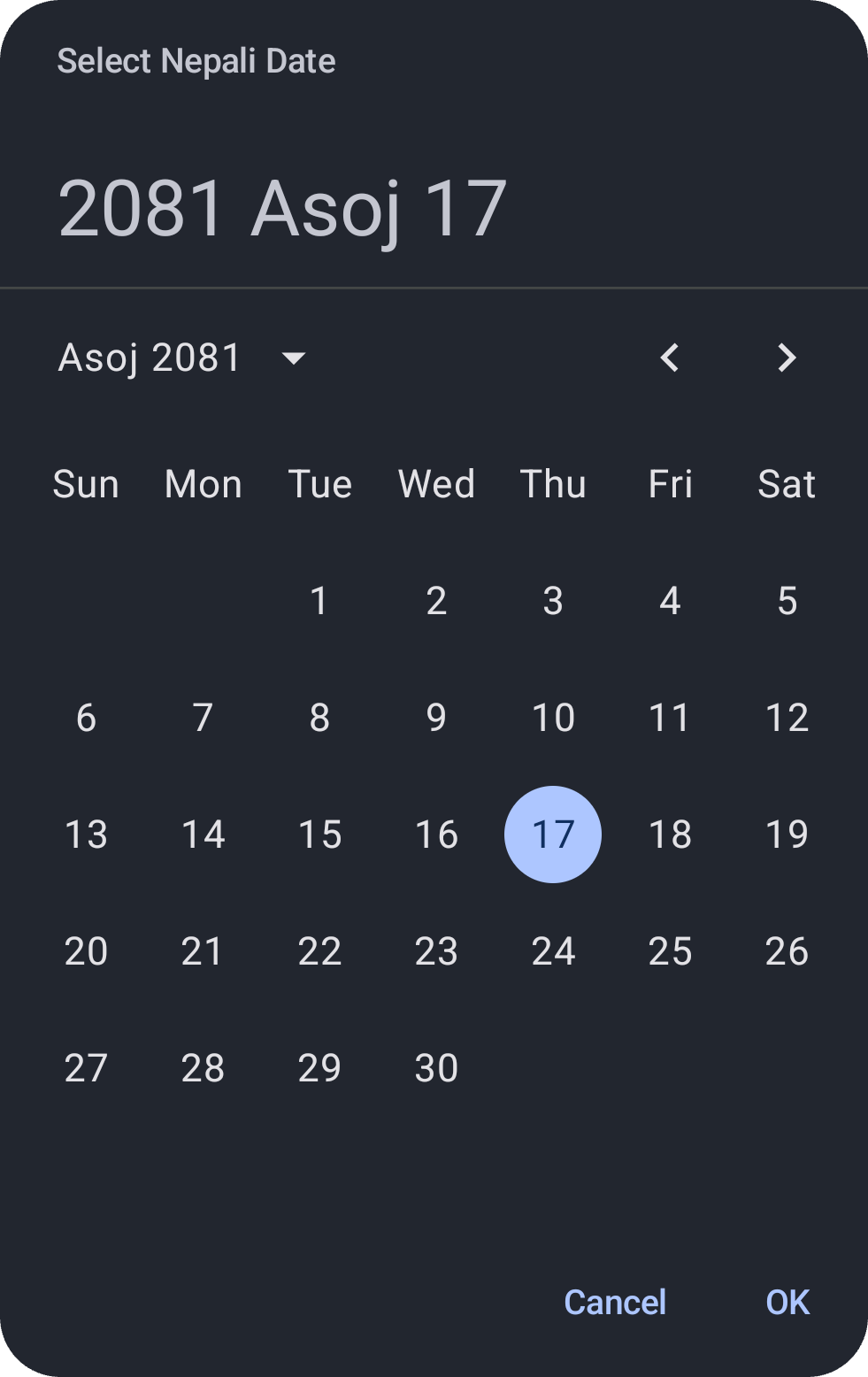 NepaliDatePicker(state = defaultNepaliDatePickerState)