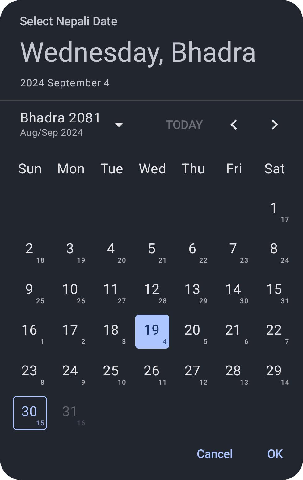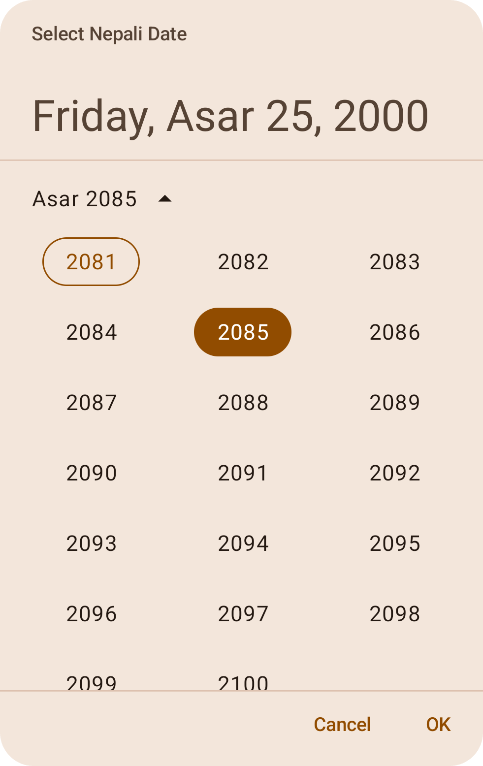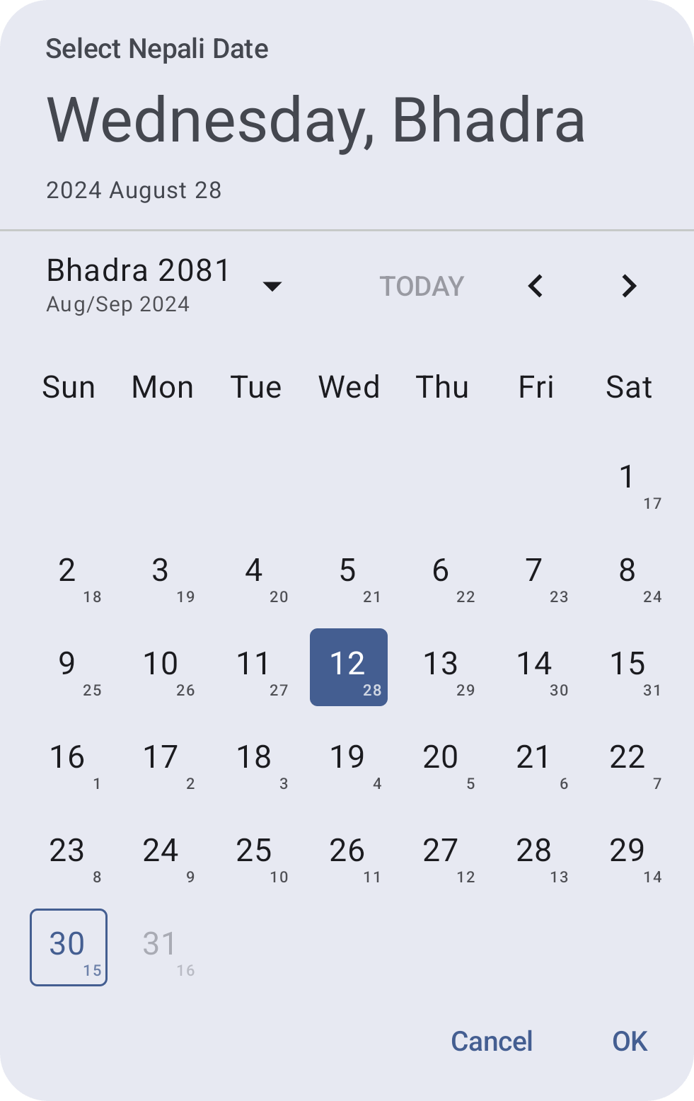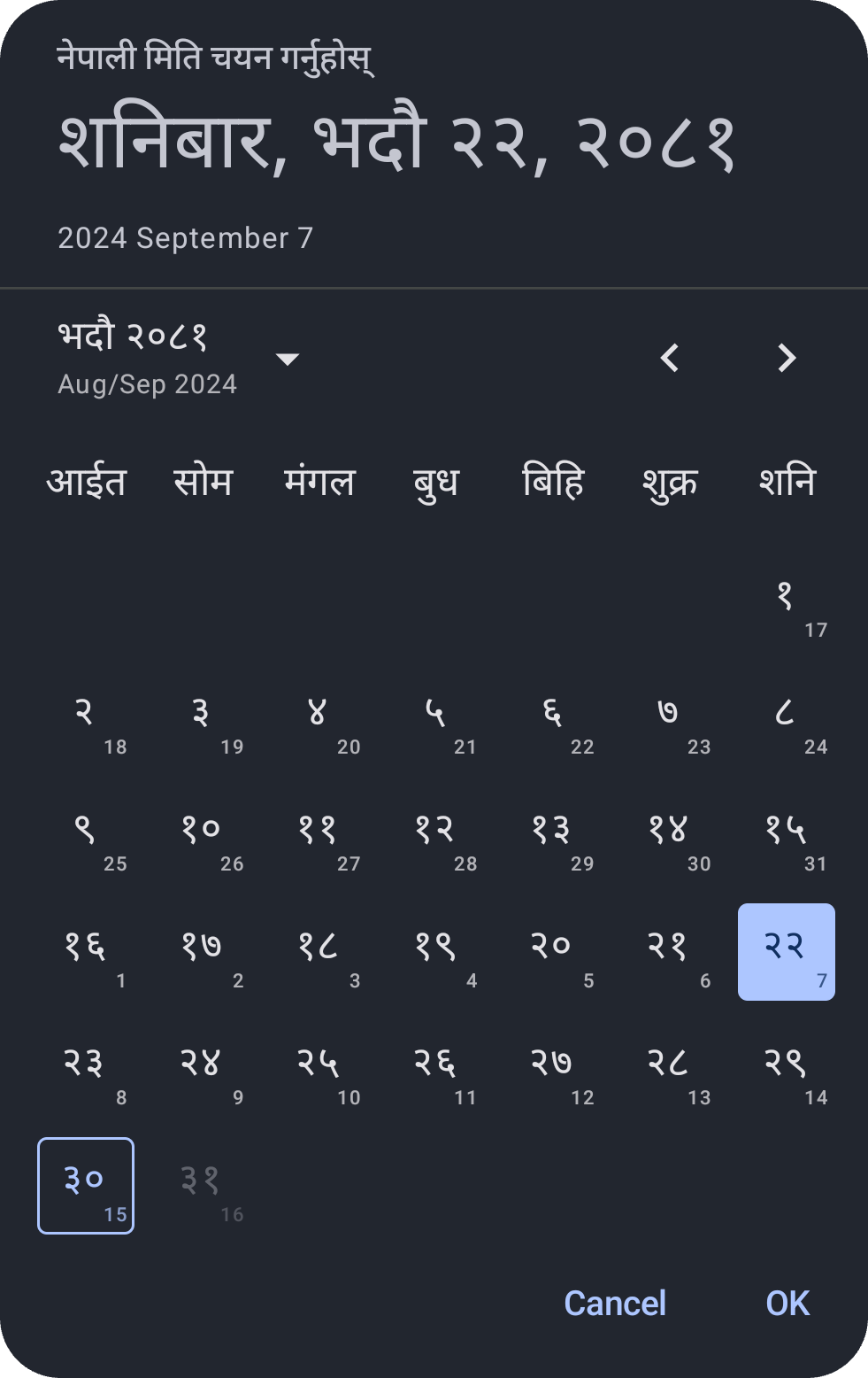 Aligns with Material3 Date Picker, offering UI and utilities for Nepali Dates. Bridges Nepali and Gregorian Calendars with customizable features and state management for date selection.