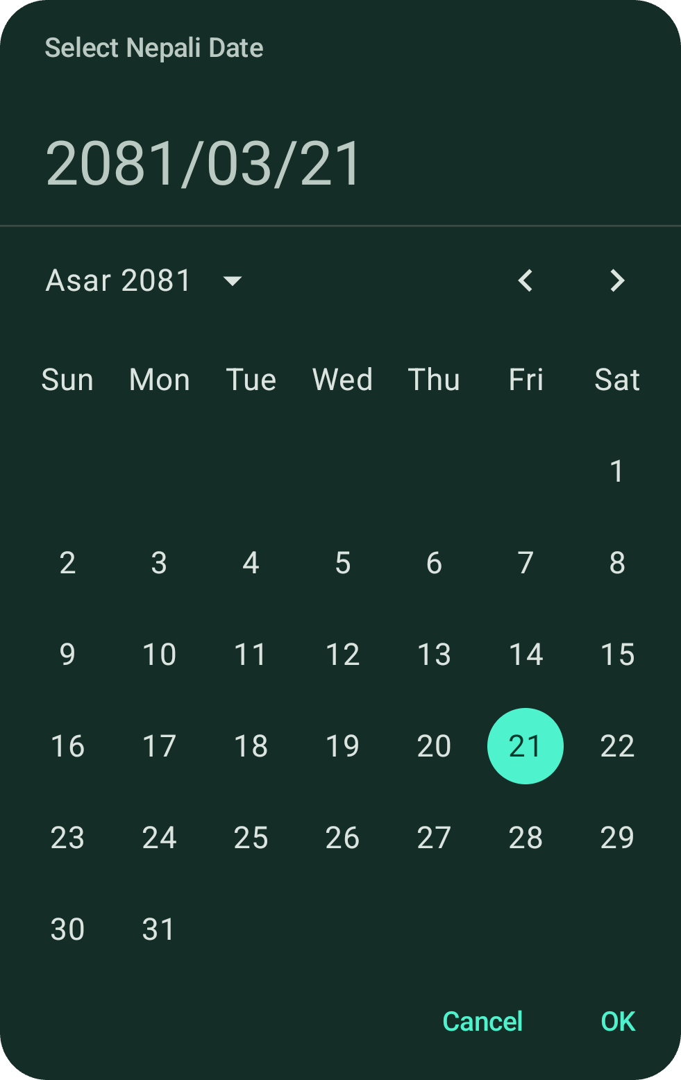val formattedNepaliDate = NepaliDateConverter.formatNepaliDate(2081, 3, 21, 5, NepaliDatePickerDefaults.DefaultLocale) // returns "Asar 21, 2081"