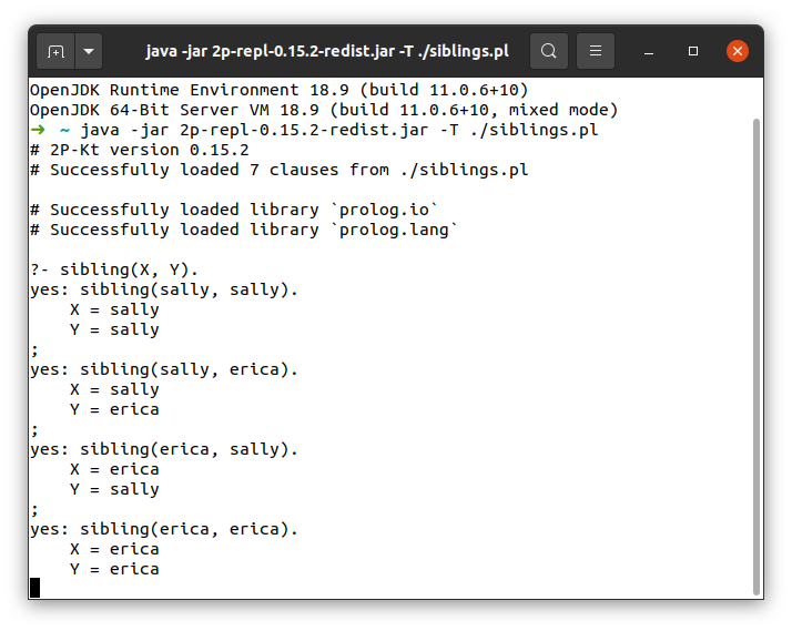 java -jar 2p-repl-VERSION-redist.jarThis should start an interactive read-eval-print loop accepting Prolog queries. A normal output should be as follows: